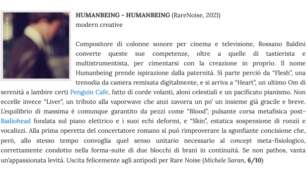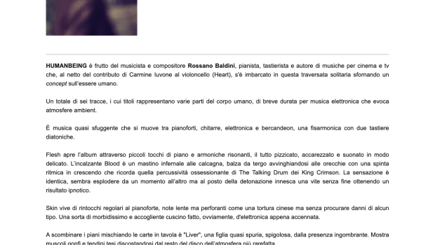 HumanBeing is the electronic persona/project of Italian composer and pianist Rossano Baldini.